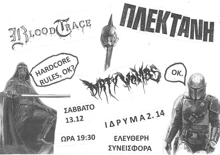 Το Σάββατο 13/12 () λαιβακι φωτιά με Blood Trace , Dirty Wombs και Πλεκτάνη στο υπόγειο μας ο,τι πρέπει για λικνισμα και απογευματινοβραδινά μπυρακια! Θυμίζουμε ότι αρχίζουμε νωρίς και τελειώνουμε νωρίς και σεβόμαστε τη γειτονιά για να μην έχουμε μελλοντικά προβλήματα. Θα αρχίσουμε νωρίς όντως! Οπότε be there on time..