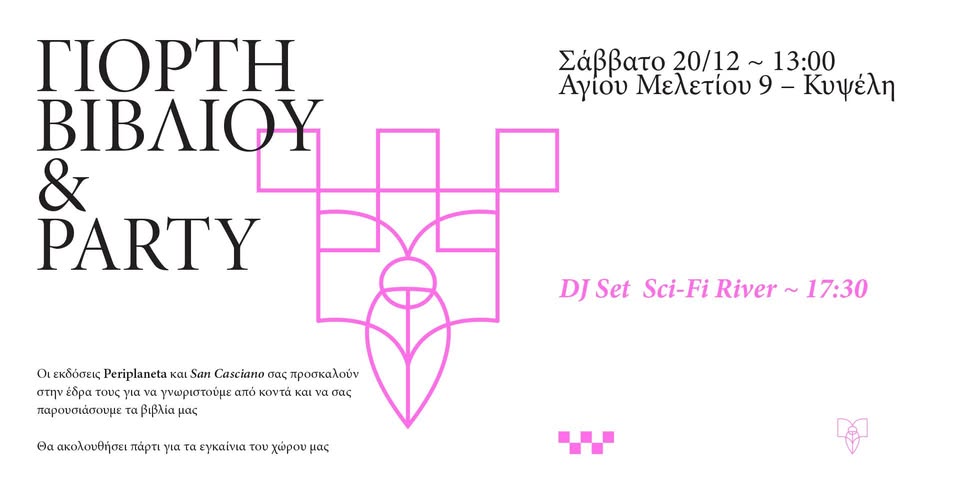 Μετά την πρώτη μας συνάντηση στο Κομπραί το Σάββατο που μας πέρασε, και με αφορμή τα εγκαίνια του χώρου όπου στεγάζονται οι εκδόσεις μας (Εκδόσεις Εκδόσεις Periplaneta & Εκδόσεις San Casciano), σας προσκαλούμε εκ νέου να βρεθούμε από κοντά, σε μια πιο χαλαρή ατμόσφαιρα, υπό τους ήχους της εκπληκτικής Dj Sci-Fi River.