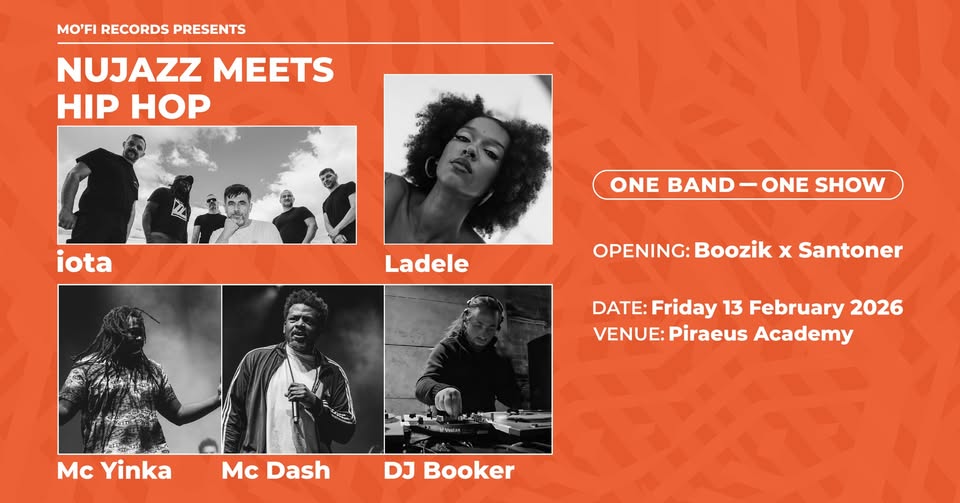 Η MO’FI Records παρουσιάζει: Nu jazz meets hip hop: One Band, One Show, με τους iota, Ladele, Urban Lynx (MC Yinka και MC Dash) και DJ Booker να μοιράζονται στη σκηνή του Piraeus Academy ως μία ενιαία μπάντα, παρουσιάζοντας ένα δυναμικό concept live που συνδυάζει nu jazz, hip hop, live instruments, ηλεκτρονικά layers και turntablism και ενώνει διαφορετικούς μουσικούς κόσμους, με grooves, φωνητικά, rap, αυτοσχεδιασμούς και δυνατή ενέργεια πάνω στη σκηνή.