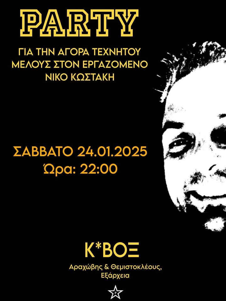 Το Σάββατο, 24 Ιουανουρίου, στις 22:00, σας καλούμε στο Κοινωνικό Κέντρο Βοξ, όπου διοργανώνεται πάρτυ οικονομικής ενίσχυσης της προσπάθειας του εργαζόμενου Νίκου Κωστάκη για την αγορά τεχνητού μέλους.
