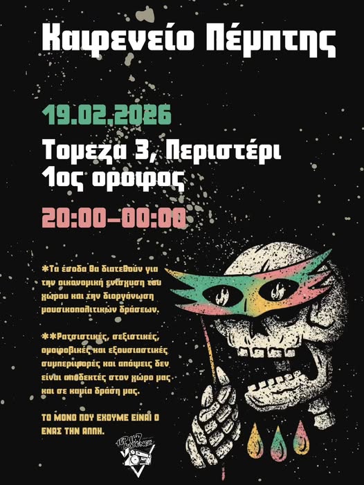 **Ρατσιστικές, σεξιστικές, ομοφοβικές και εξουσιαστικές συμπεριφορές και απόψεις δεν είναι αποδεκτές στον χώρο μας και σε καμία δράση μας.
